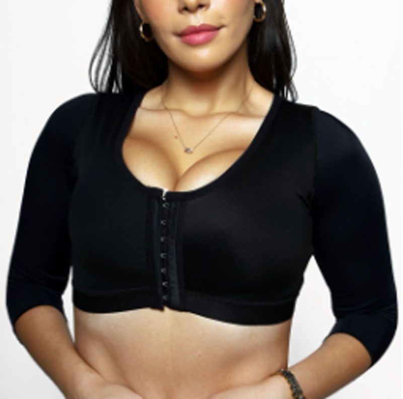 This garment is made with dermatologist-tested fabrics. This post-surgical bra features full bust coverage, elbow-length sleeves, reinforced back support for improved posture, and two rows of front hooks. It helps reduce swelling after surgery, providing enhanced support and comfort.